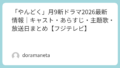 関連キーワード:2026年冬ドラマ, 2026冬ドラマ放送日, 冬ドラマ一覧, 日曜劇場, NHK大河, 月9ドラマ, 深夜ドラマ