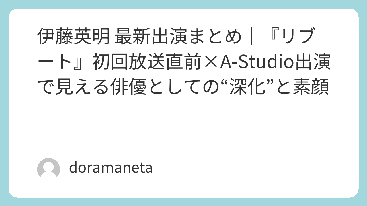 ドラマの役柄とはまた違う“人間・伊藤英明”としての素顔や、俳優としての原点・家族観などを語ることが予想されます。放送は『リブート』初回放送のあと、ドラマの余韻を高める形での登場となるため、ファンにとって見逃せない番組です。