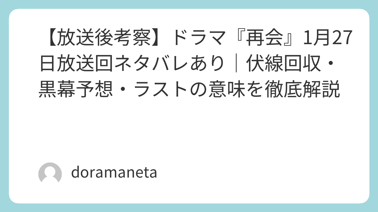 - ディスクリプション例:ドラマ『再会』1月27日放送回の放送後考察。重要シーンの意味、伏線回収、黒幕予想、ラスト解釈をプロ視点で整理。