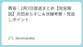 補足:公式のバックナンバー/番組ページと主要メディアの次回情報を突き合わせています。より詳しい各話テキストはフジテレビ公式バックナンバーと特集をご確認ください。