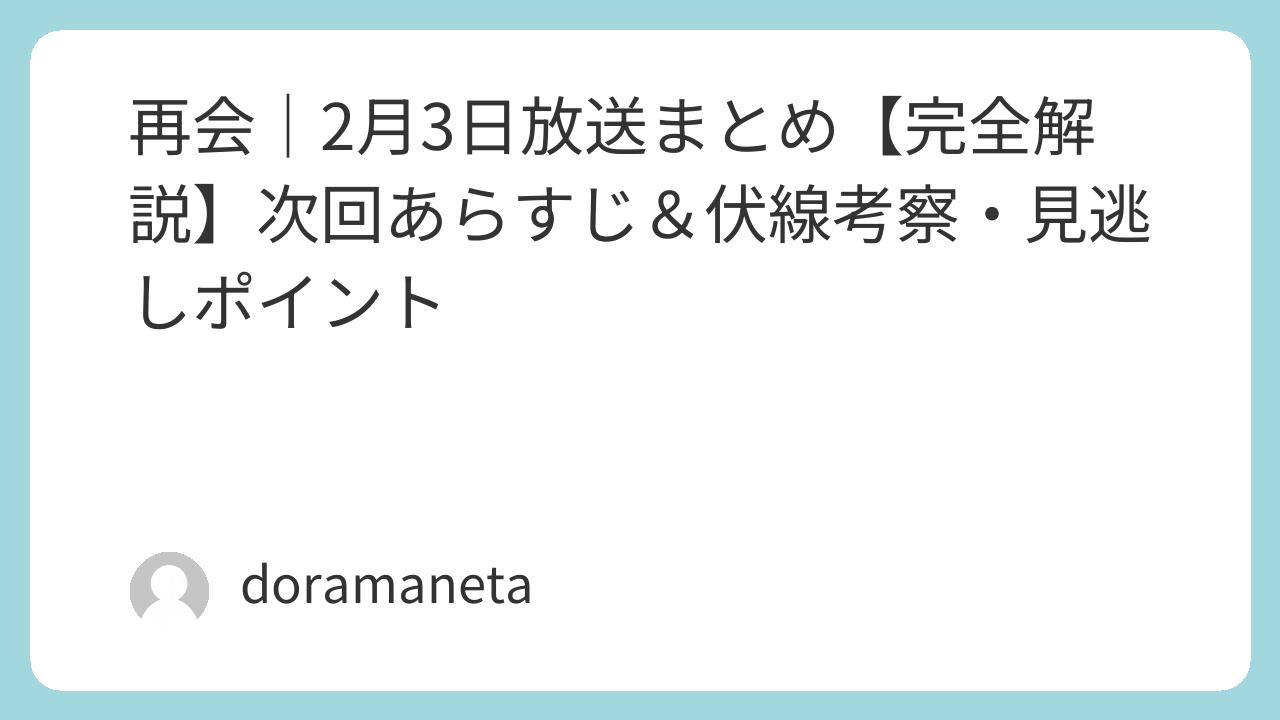 本記事は「再会」2月3日放送回の内容を、5分で把握できる要約深掘り考察の両輪で整理します。ネタバレを含むため、未視聴の方はご注意ください。視聴直後の復習、伏線の確認、次回への備えに役立つ構成です。